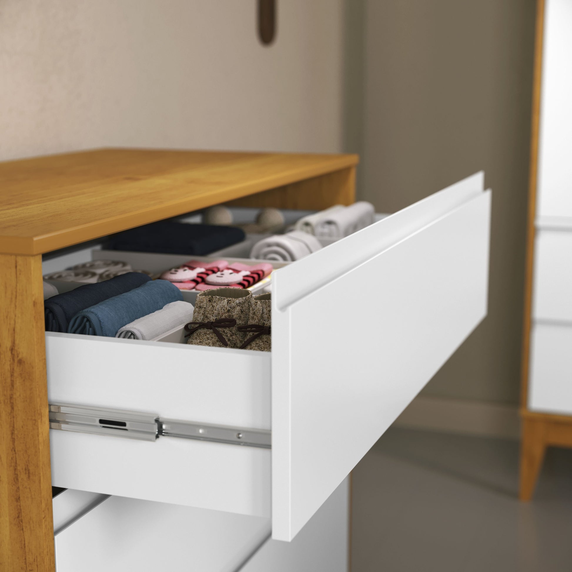 CARACTERÍSTICAS- EXCLUSIVO Sistema Antivuelco - 100% MDF - Guías telescópicas - Mangos mecanizados - Base estructural de madera - Divisores en los dos cajones superiores.