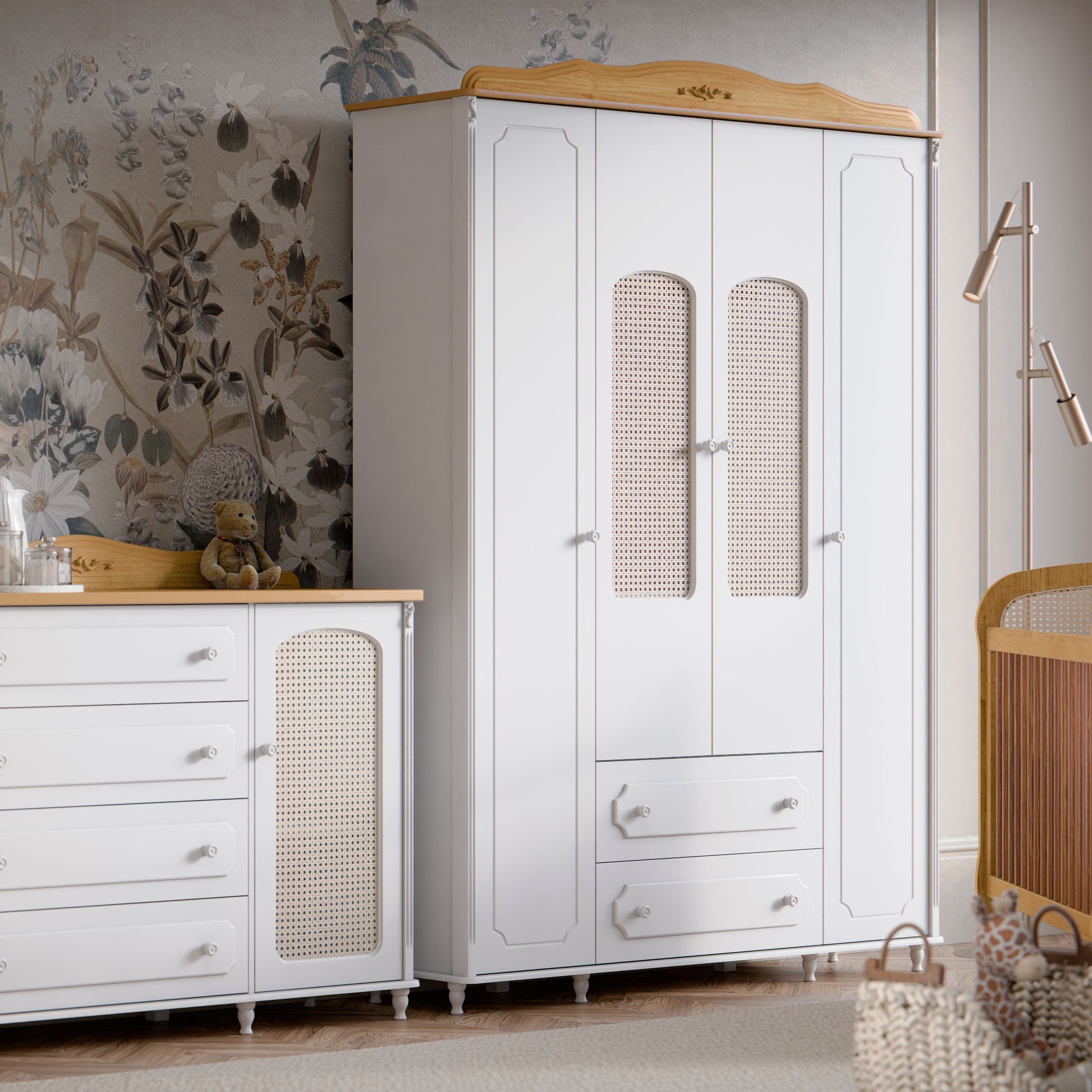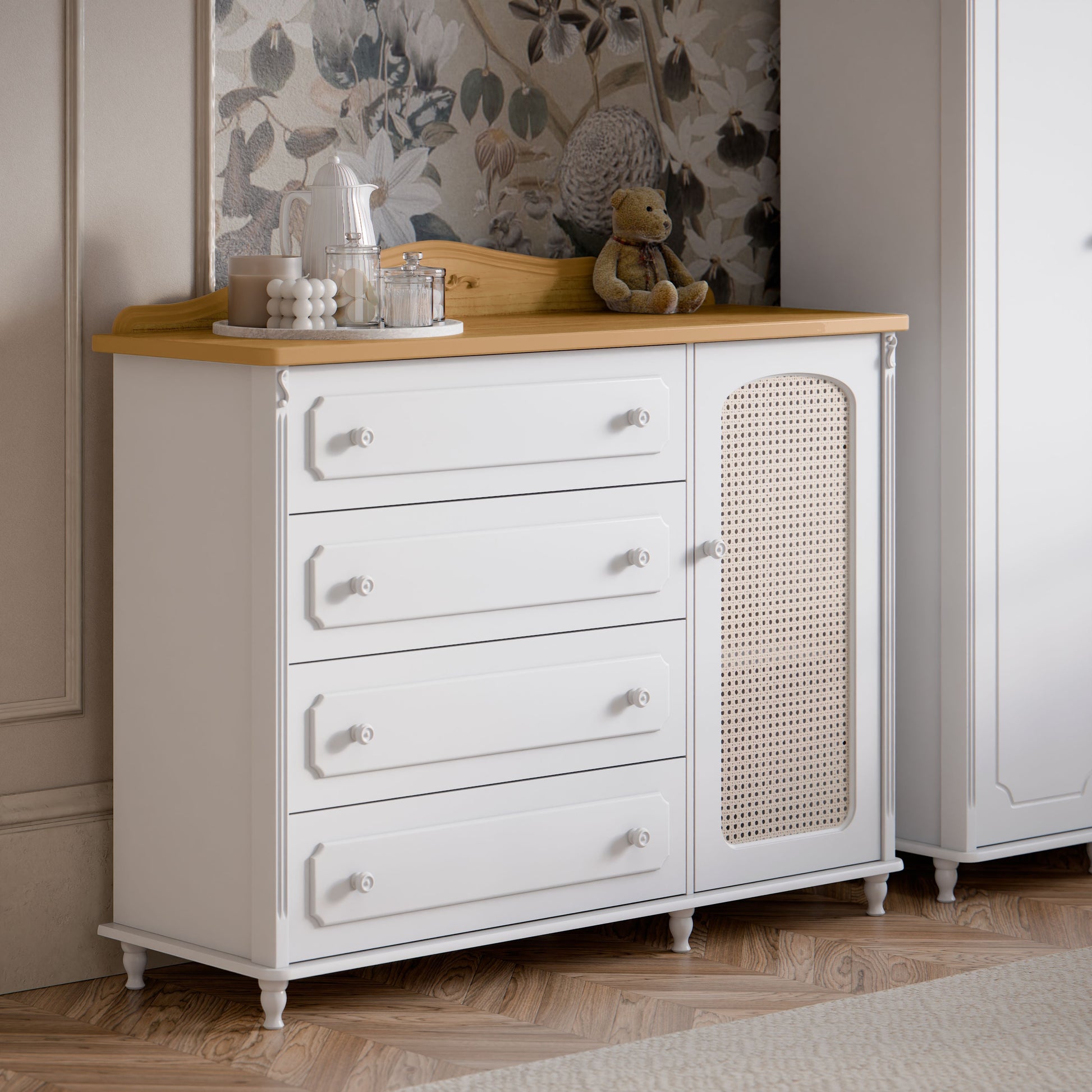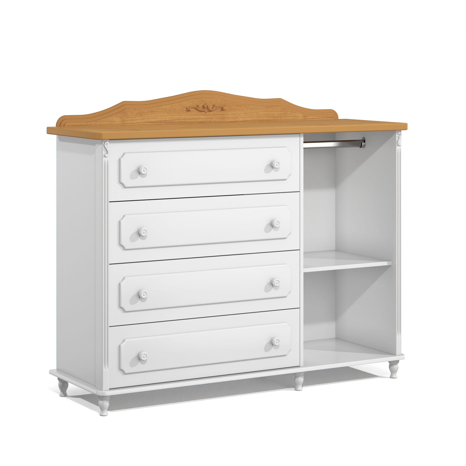 CARACTERÍSTICASEXCLUSIVO sistema antivuelco. 100% MDF; Guías telescópicas; Manijas y pies con detalle provenzal; Tapa en 27mm; Perchero de aluminio;