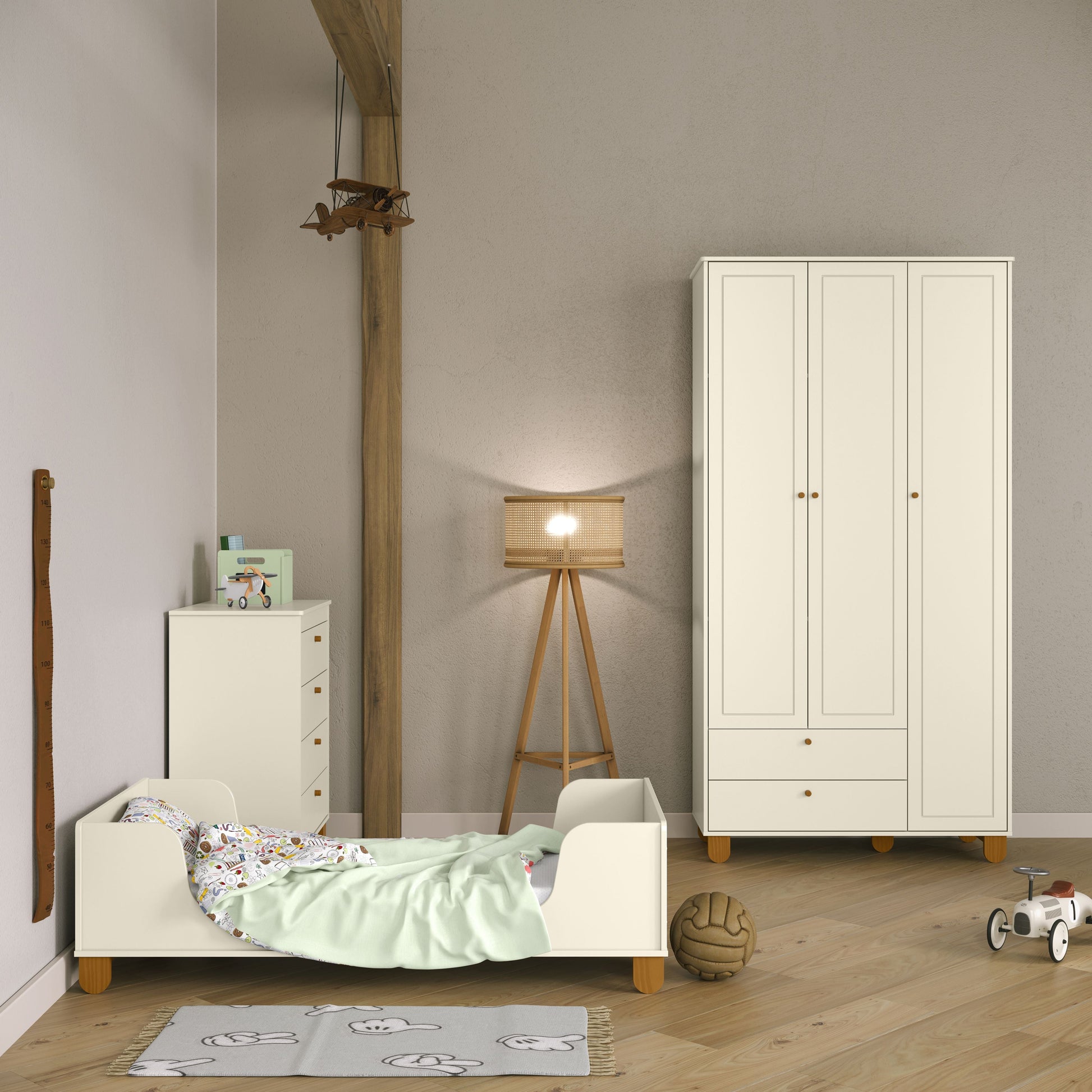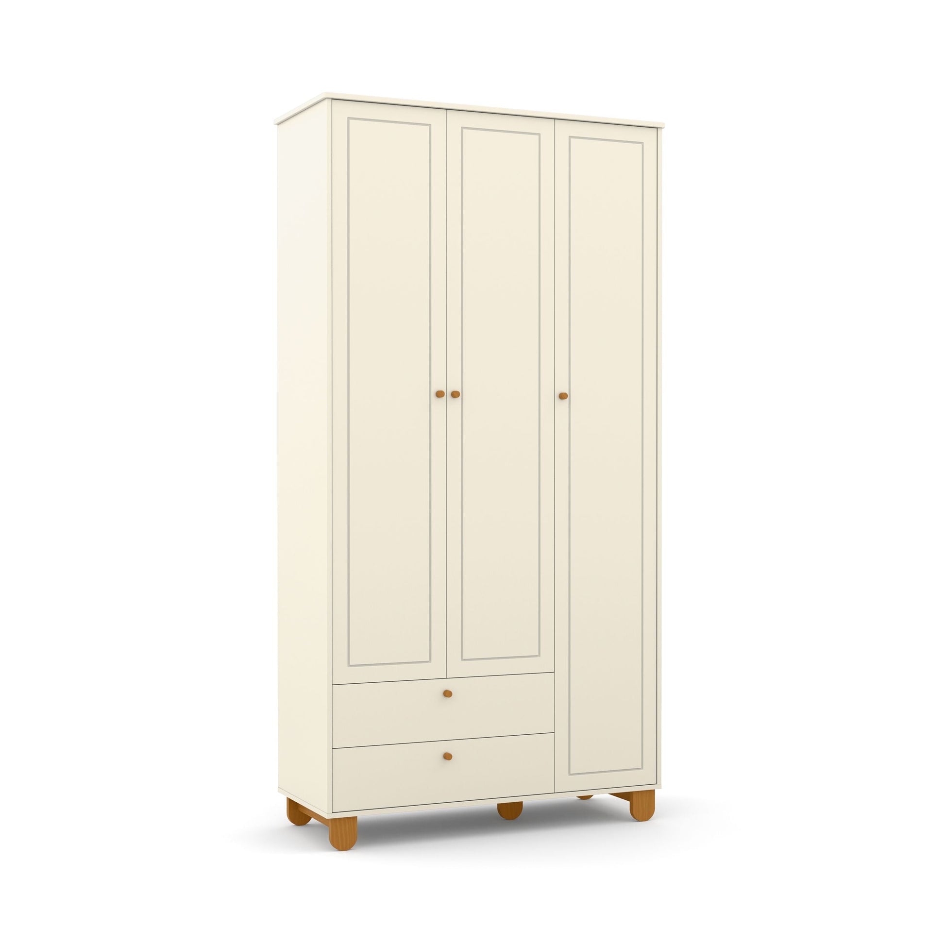 Las puertas con detalles en bajo relieve aportan un toque decorativo al ropero, haciéndolo visualmente atractivo y adecuado para una habitación infantil.